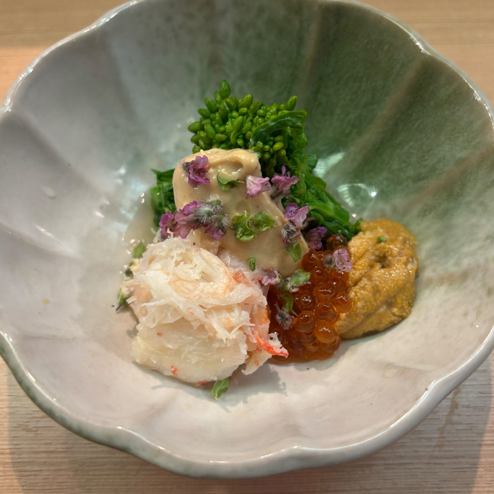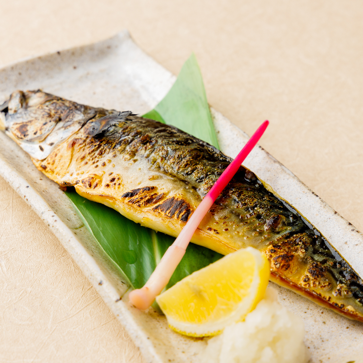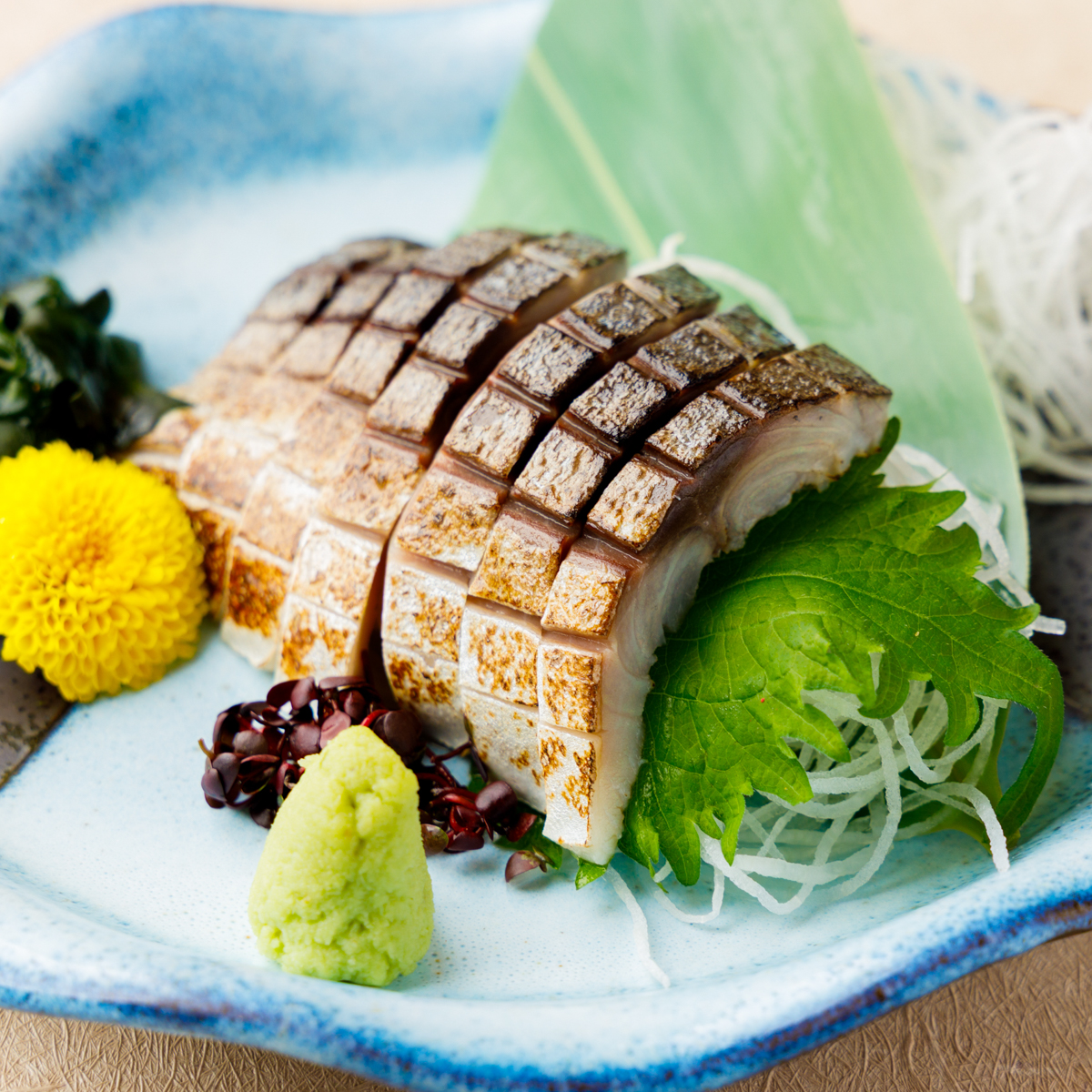 脂がのっているモンドセレクション受賞の鯖を目の前で炙って仕上げます。